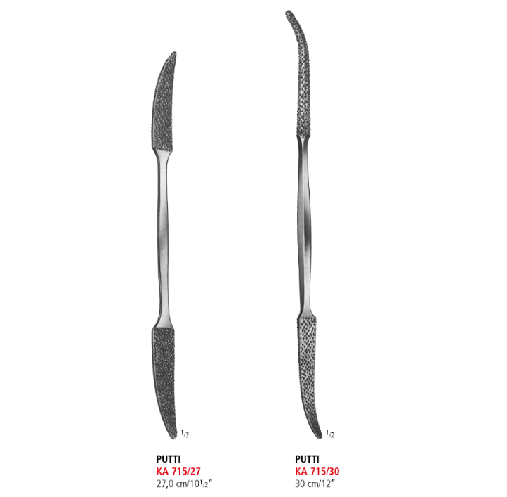 Putti Rasp is designed for precise shaping, smoothing, and contouring of bone, cartilage, and hard tissues in orthopaedic, neurosurgical, and plastic surgeries. Featuring varied blade shapes and tapering designs for accessing narrow spaces.